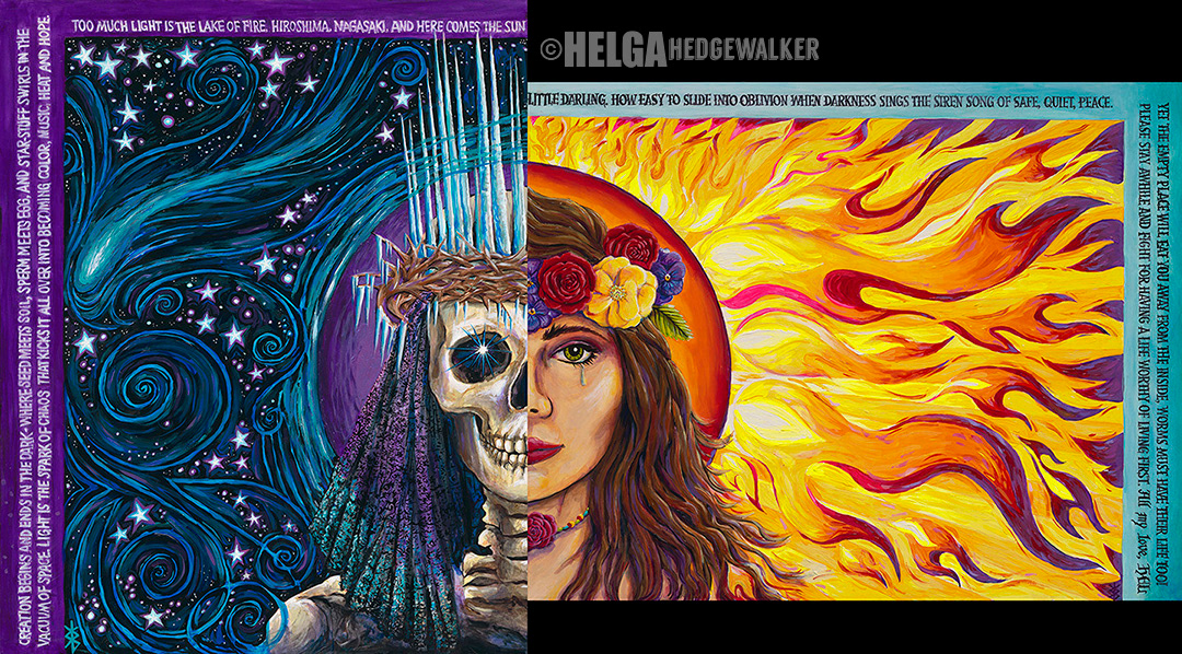 The text on the painting reads as follows: "Creation begins and ends in the dark -- where seed meets soil, sperm meets egg, and star-stuff swirls in the vacuum of space. Light is the spark of chaos that kicks it all over into becoming color, music, heat and hope. Too much light is the lake of fire, Hiroshima, Nagasaki,